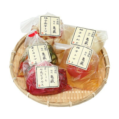 【名称】梅干・漬物・佃煮【事業者名・販売者名】京漬物亀蔵(株式会社たつみ食品)【所在地】京都府【数量(容量)・内容】柚子トマト(1ヶ)×1袋、青じそトマト(200g)×1袋、柚子長芋トマト(180g)×1袋、七色ピクルス(100g)×1袋、柚子玉ねぎ(1ヶ)×1袋【賞味期間】柚子トマト、青じそトマト、柚子長芋トマト:8日間 七色ピクルス:10日間 柚子玉ねぎ:20日間【原材料】【柚子トマト】とまと、柚子、漬け原材料[砂糖、食塩、米酢、白ワイン、ゼラチン] 【青じそトマト】ミニとまと、胡瓜、新生姜、青じそ、漬け原材料[砂糖、食塩、米酢、白ワイン、ゼラチン] 【柚子長芋トマト】長いも、ミニとまと、柚子、漬け原材料[米酢、食塩、砂糖、ゼラチン] 【七色ピクルス】赤玉葱、赤パプリカ、黄パプリカ、胡瓜、セロリ、ミニとまと、漬け原材料[米酢、食塩、砂糖、ブラックペッパー] 【柚子玉ねぎ】玉葱、柚子、漬け原材料[米酢、食塩、砂糖、醤油](原材料の一部に小麦、大豆を含む)【仕様】掲載商品には、アレルギーの原因といわれる原材料を含んでいる場合がございます。