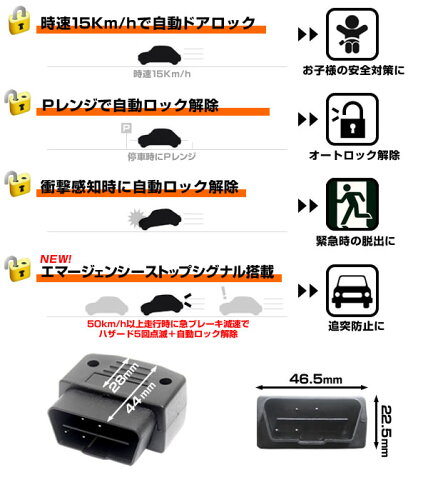 セレナ c26 パーツ 【OBD2 車速連動オートドアロック】日産 N02 [C25 C26 セレナ][エルグランドE52][ノートE12 マーチ][nv350キャラバン(マイチェン前のみ)]車速連動でPレンジで自動ロック解除! 車速ドアロック 日産 【セレナ26】[C25 C26 セレナ][エルグランドE52][ノートE12 マーチ][nv350キャラバン(マイチェン前のみ)] 車速オートドアロック Ver.2 高級車に標準装備されている車速連動の自動ドアロックを おてがるに追加できる超便利アイテムです! お子様のいたずらなどで走行中のドアが 開閉する心配も無くなるので安心!! 時速15〜20Kmになるとオートドアロックがかかり、 停車時にPレンジで自動ロック解除、 衝撃感応のアンロック機能も搭載されております。